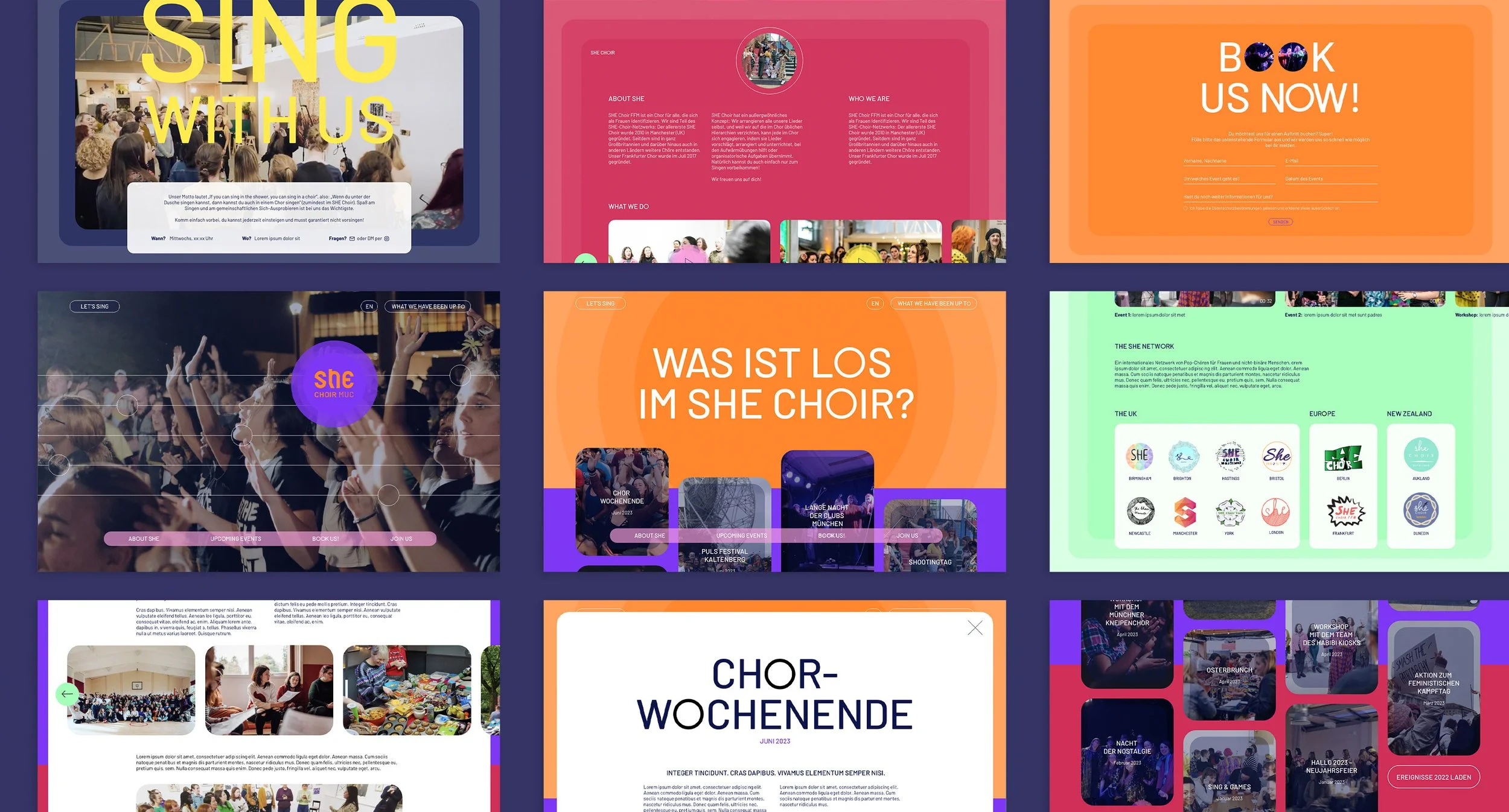 The aim of SHE Choir is, on the one hand, to show visitors to their website exactly what the community is about, and on the other hand, to attract potential new members and performances. With a site structure reduced to the essentials, the user quickly gets an overview of the choir and what it has to offer. Clearly structured and attractively presented content in combination with visual storytelling in the form of video and image content gives the visitor a quick impression. Strategically placed call-to-action buttons motivate the user to get in touch with the choir, thus increasing engagement on the website and also the choir‘s profile in general.